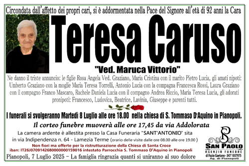 I funerali si svolgeranno Martedì 8 Luglio alle ore 18.00 nella chiesa di S. Tommaso D'Aquino in Pianopoli.