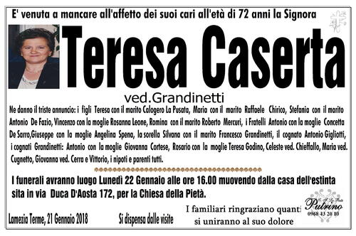 I funerali avranno luogo Lunedì 22 Gennaio alle ore 16.00 muovendo dalla casa dell'estinta