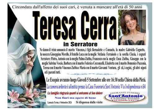 Ne danno il triste annuncio il marito Vincenzo, i figli: Bernadette e Consuelo, la madre Gabriella Cugnetto, la suocera Giuseppina Morello, il fratello Luca con la moglie Stefania Ferraiuolo e la sorella Cinzia, i cognati Serratore: Pietro, Antonio con la moglie Palma Zubba, Francesco con la moglie Enza Zubba, Giuseppe con la moglie Sabrina Vescio, Barbara con il marito Federico Cocconcelli, Elisabetta con il marito Domenico Puzzonia, Teresa con il marito Vincenzo Zubba e Maria con il marito Giovanni Ventura, gli zii, i cugini, gli altri nipoti ed i parenti tutti.