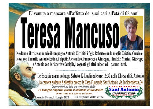 Ne danno il triste annuncio il compagno Antonio Citriniti, i figli: Roberto con la moglie Cristina Curcio e Rosa con il marito Antonio Estino, i nipoti: Alessandro, Francesco e Giuseppe, i fratelli: Marisa, Giuseppe e Antonio con le rispettive famiglie, i cognati, gli altri nipoti e parenti tutti.