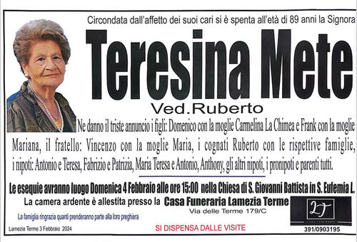 i nipoti: Antonio e Teresa, Fabrizio e Patrizia, Maria Teresa e Antonio, Anthony, gli altri nipoti, i pronipoti e parenti tutti.