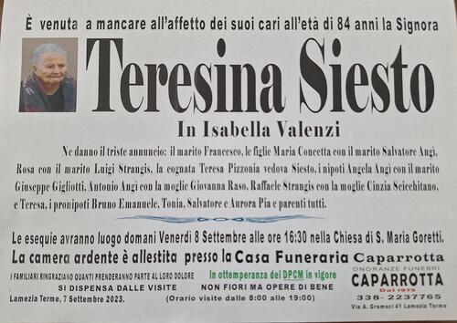 Ne danno il triste annuncio: Il marito Francesco, le figlie Maria Concetta con il marito Salvatore Angì, Rosa con il marito Luigi Strangis, la cognata Teresa Pizzonia Ved. Siesto, i nipoti Angela Angì con il marito Giuseppe Gigliotti, Antonio Angì con la moglie Giovanna Raso, Raffaele Strangis con la moglie Cinzia Scicchitano e Teresa, i pronipoti Bruno Emanuele, Tonia, Salvatore e Aurora Pia e parenti tutti.