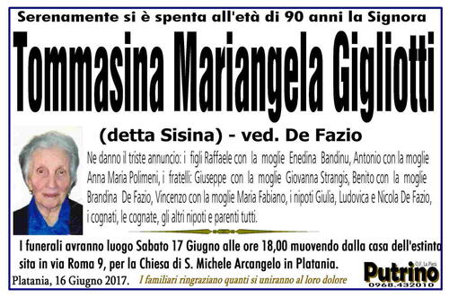 I funerali avranno luogo Sabato 17 Giugno alle ore 18,00 muovendo dalla casa dell'estinta