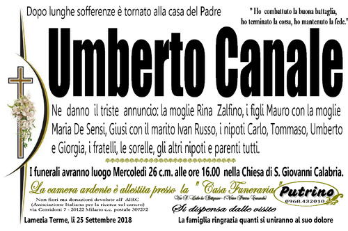 I funerali avranno luogo Mercoledì 26 c.m. alle ore 16.00 nella Chiesa di S. Giovanni Calabria.