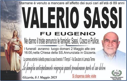 I funerali avranno luogo domani 2 Maggio alle ore 16:00, nella Chiesa della SS.Annunziata in Gizzeria.