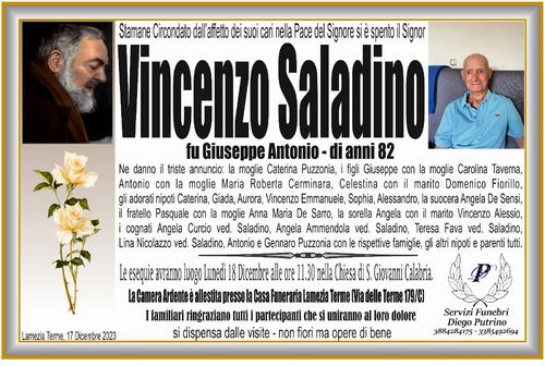 Ne danno il triste annuncio: la moglie Caterina Puzzonia, i figli Giuseppe con la moglie Carolina Taverna, Antonio con la moglie Maria Roberta Cerminara, Celestina con il marito Domenico Fiorillo, gli adorati nipoti Caterina, Giada, Aurora, Vincenzo Emmanuele, Sophia, Alessandro, la suocera Angela De Sensi, il fratello Pasquale con la moglie Anna Maria De Sarro, la sorella Angela con il marito Vincenzo Alessio, i cognati Angela Curcio ved. Saladino, Angela Ammendola ved. Saladino, Teresa Fava ved. Saladino, Lina Nicolazzo ved. Saladino, Antonio e Gennaro Puzzonia con le rispettive famiglie, gli altri nipoti e parenti tutti.