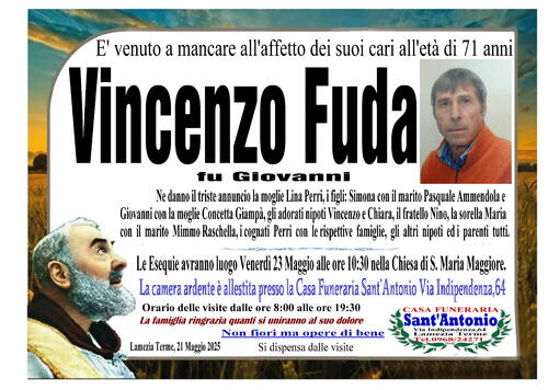 Ne danno il triste annuncio la moglie Lina Perri, i figli Simona con il marito Pasquale Ammendola e Giovanni con la moglie Concetta Giampà, gli adorati nipoti: Vincenzo e Chiara, il fratello Nino, la sorella Maria con il marito Mimmo Raschella, i cognati Perri con le rispettive famiglie, gli altri nipoti ed i parenti tutti.