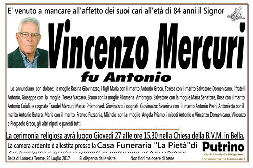 Lo annunciano con dolore: la moglie Rosina Giovinazzo, i figli Maria con il marito Antonio Greco, Teresa con il marito Salvatore Domenicano, i fratelli Antonio, Giuseppe con la moglie Teresa Vaccaro, Bruno con la moglie Filomena Ambrogio, Salvatore con la moglie Maria Senatore, Rosa con il marito Antonio Cuiuli, le cognate Traudel Mercuri, Maria Priamo ved. Giovinazzo, i cognati Giovinazzo: Saverina con il marito Antonio Perri, Antonietta con il marito Antonio Butera, Maria con il marito Franco Puzzonia, Michele con la moglie Angela Priamo, i nipoti Antonio e Vincenzo Domenicano, Vincenzo e Pierpaolo Greco, gli altri nipoti e parenti tutti.
