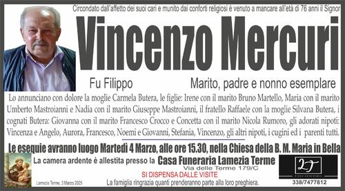 Lo annunciano con dolore la moglie Carmela Butera, le figlie: Irene con il marito Bruno Martello, Maria con il marito