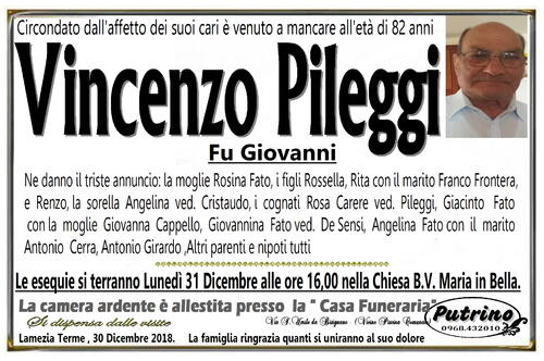 lLe Esequie si terranno Lunedì 31 Dicembre alle ore 16,00 nella Chiesa B.V. Maria in Bella.