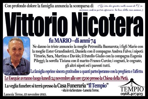 Le Esequie avranno luogo lunedì 24 novembre alle ore 15:00 presso la Chiesa della Pietà.