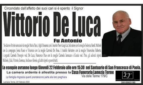 Ne danno il triste annuncio la moglie Maria Pace, i figli: Rosanna con il marito Piero Luigi Lai, Salvatore con la moglie Federica Banfi, Michele